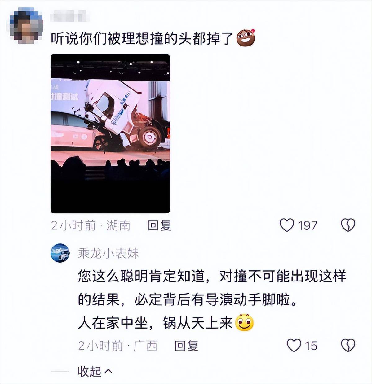 然而,测试中乘龙重卡在碰撞后驾驶室倒扣、方向盘弹起等画面,引发部分乘龙车主质疑。有车主在社交媒体表示:“欢迎理想再来测试,若出现问题双方不担责。”乘龙卡车官方抖音账号曾评论“被摆了一道”,并称“实际碰撞结果会不同”,但随后删除相关内容。